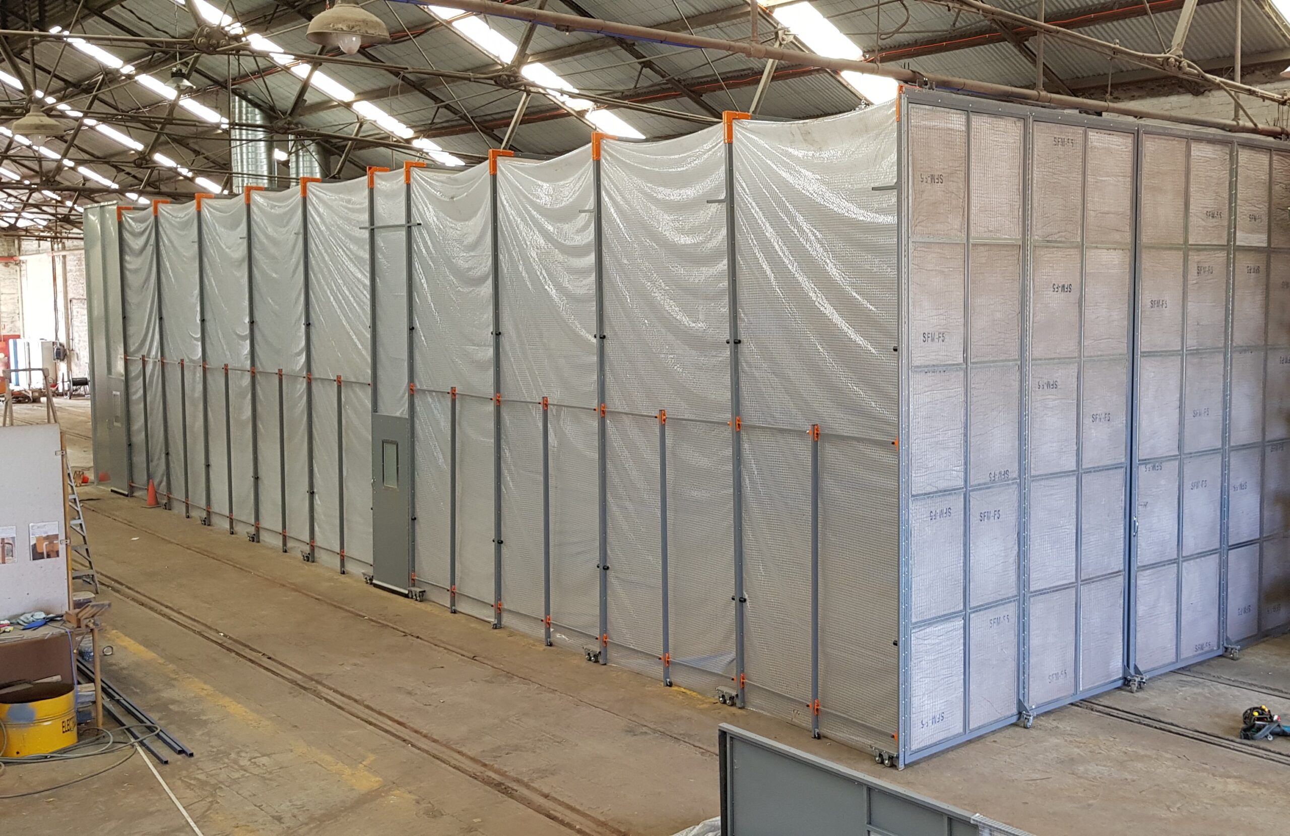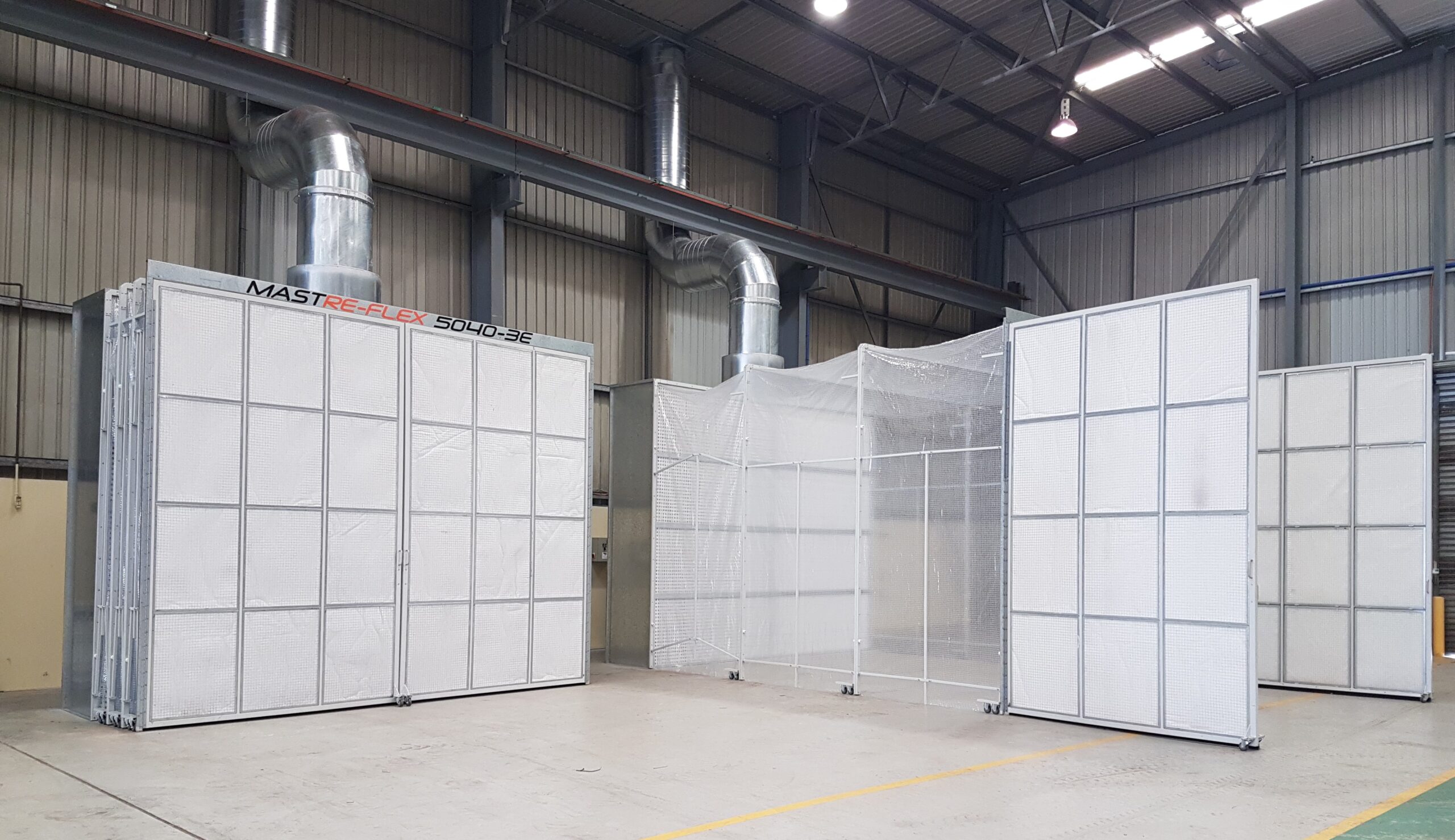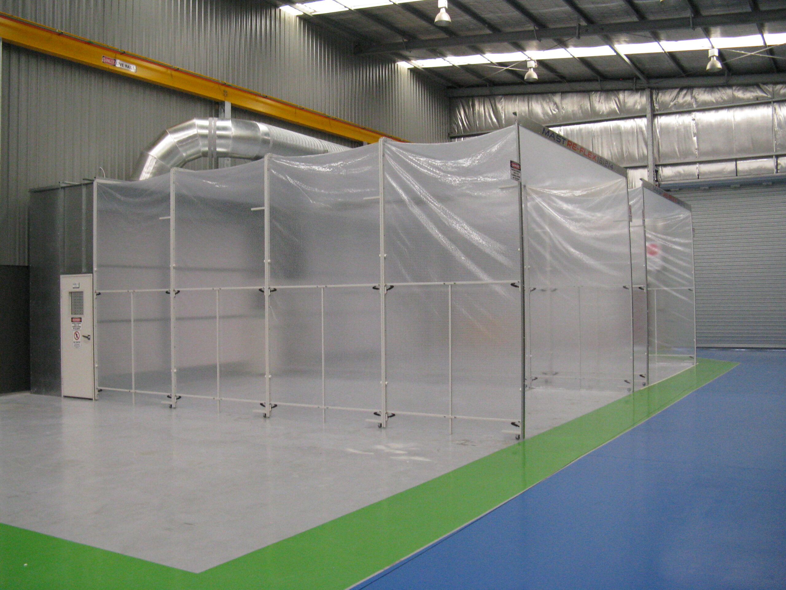 The MASTRE-FLEX Retractable Spray Booth System is the ideal solution to painting heavy, hard-to-manage work pieces. The whole work area can be simply folded out of the way and then pulled around the item once it has been lifted into position. The clear cover-sheeting allows for excellent visibility, and due to its modular design can be made to accommodate almost any location or work piece size. Width  From 3 metres Height From 3 metre Depth From 2 metres